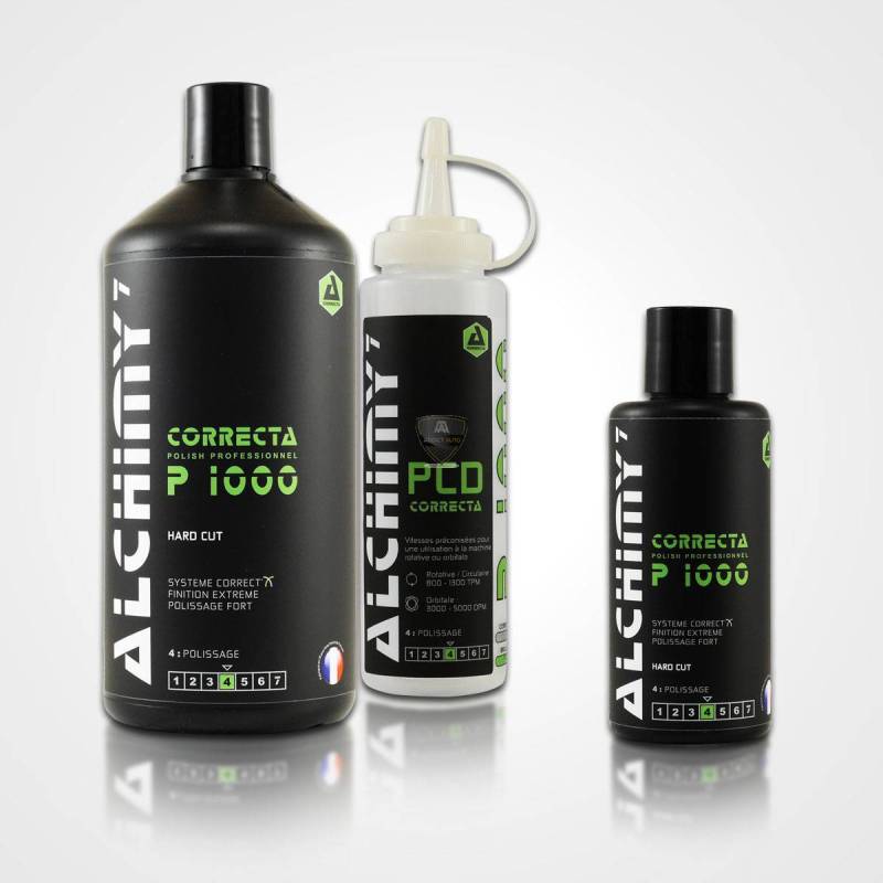 Alchimy7 Correcta P1000 est un composé abrasif permettant la correction très rapide des rayures, des micro-rayures (tourbillons), de l'oxydation et des marques de ponçage jusqu'au grain P1200.
